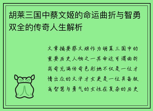 文章摘要:蔡文姬作为《胡莱三国》中的重要历史人物之一,其命运可谓曲折离奇,充满传奇色彩。她不仅是一位才情出众的文学才女,更是一位具备极高智慧与勇气的女性。在复杂的历史背景下,蔡文姬经历了亲人离散、战争破碎、身世悲惨等多重打击,但她从未向命运低头。在游戏中,蔡文姬的智慧、勇敢和坚韧不拔的个性得到了充分体现。本文将从四个方面深入探讨蔡文姬在《胡莱三国》中的命运与传奇人生,分别从她的悲惨经历、智勇双全的个人品质、在战场上的表现以及她如何在困境中逆袭这四个角度来剖析这一人物的多面性。通过对蔡文姬的命运与性格的解读,本文不仅揭示了她复杂的内心世界,还探讨了女性在乱世中如何用智慧和勇气获得尊严与地位。